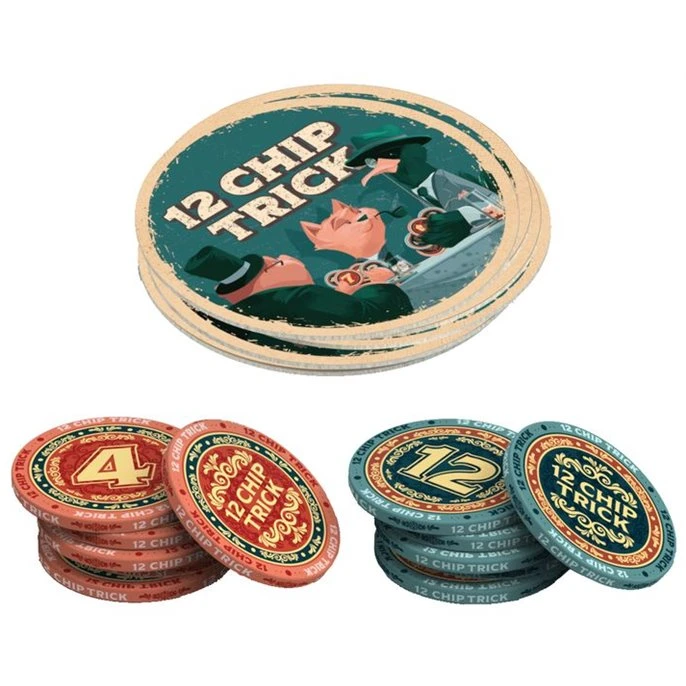 12 Chip Trick est un jeu de plis avec des jetons. Le jeu se déroule en plusieurs manches. Une succession de plis va vous permettre de scorer vos jetons. Mais prudence car si votre score dépasse 21, c’est l’explosion.