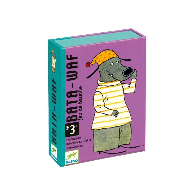 Règle du jeu :36 cartes Récupérer toutes les cartes du jeu. Distribuer toutes les cartes. Chaque joueur forme un paquet avec ses cartes, qu’il pose devant lui face cachée. Les joueurs retournent en même temps la première carte de leur paquet. Celui qui a mis la carte avec le chien le plus gros remporte le pli.Parfois il arrivera que les joueurs retournent deux cartes avec des chiens de même taille. Dans ce cas, il doivent dire « Bata-Wafa ». Ils mettent chacun au-dessus de leur carte une autre carte, face cachée cette fois-ci. Puis encore une autre carte découverte. Celui qui à mis la dernière carte avec le chien le plus gros remporte toutes les cartes du pli. Les enfants qui ne savent pas compter peuvent aisément repérer qui remporte le pli, en comparant la taille des chiens.