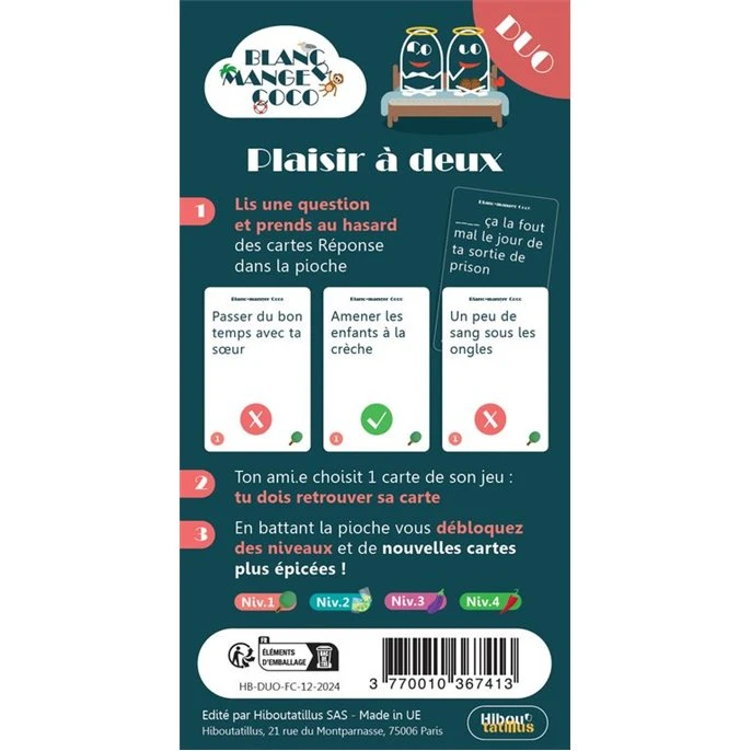 Plaisir à Deux : version « duo » de Blanc-manger Coco. Tentez de battre la pioche sur 10 manches. A chaque fois que vous réussissez, vous passez au niveau supérieur, plus difficile, tout en débloquant de nouvelles cartes plus pimentées.