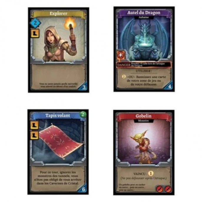 Chaque joueur incarne un héros qui évolue dans les sombres couloirs d’un donjon. Avec un soupçon de stop ou encore : vous essayez d’obtenir les meilleurs trésors possibles, bien que l’objectif soit avant tout de vous sortir de là en vie (héhé c’est pas tout ça mais il y a un dragon dans le coin !). Oui vous pouvez être éliminé du jeu si vous perdez tous vos points de vie dans les entrailles du château.