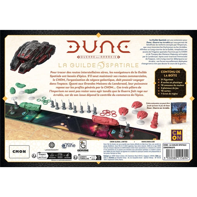 La Guilde Spatiale est une extension pour Dune : Guerre sur Arrakis. Bénéficiez de renforts envoyés par l’Imperium, que vous incarniez les Harkonnen ou les Atréides. Affrétez un Long-courrier de la Guilde, remplissez ses soutes de Frégates spatiales fournies par le CHOM et de Troupes des Maisons Majeures octroyées par le Landsraad, et changez le cours du conflit.
