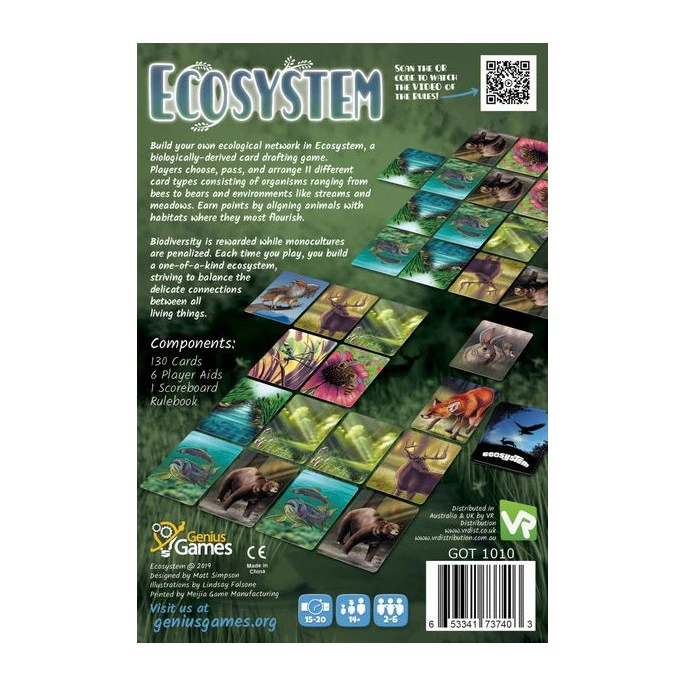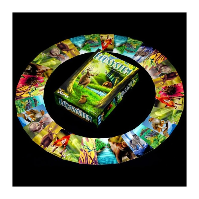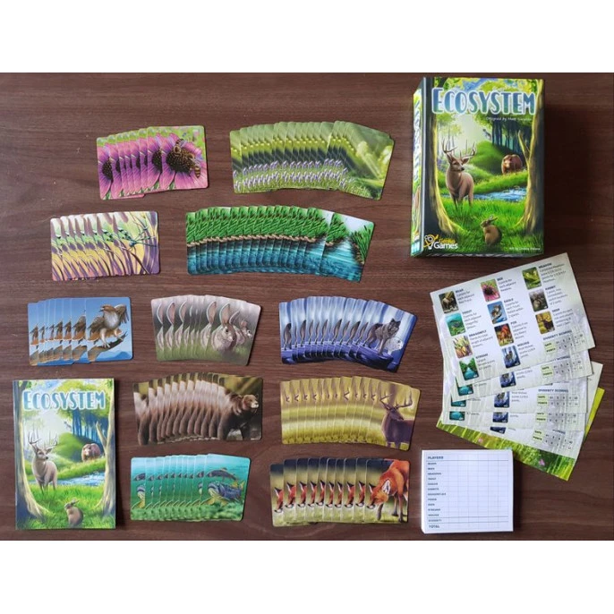 Ecosystem est un jeu de cartes dans lequel les joueurs choisissent des cartes et les placent tour à tour dans leur zone de jeu. Les cartes de la grille d’un joueur constituent son propre écosystème personnel. À la fin du jeu, un joueur aura vingt cartes dans son écosystème, le jeu comprenant onze types de cartes. Les ours marquent des points en étant placés à côté des abeilles et des truites, les truites marquent des points en étant placées à côté des ruisseaux et des libellules, et les ruisseaux sont comparés à la fin du jeu, le joueur qui a le plus grand ruisseau gagnant des points. Ce ne sont là que quelques exemples du fonctionnement du système de notation dans Ecosystem. N’oubliez pas de vous diversifier !