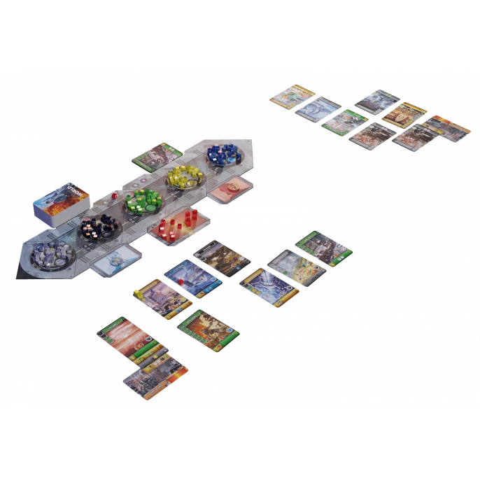 À chaque tour vous allez drafter des cartes qui vous serviront pour produire des Ressources et développer votre Empire. Après avoir fait l’acquisition de votre main de cartes, vous pourrez décider d’en recycler certaines pour acquérir des Ressources immédiatement ou de les mettre en construction pour produire des Ressources à chaque tour et gagner des points de victoire.