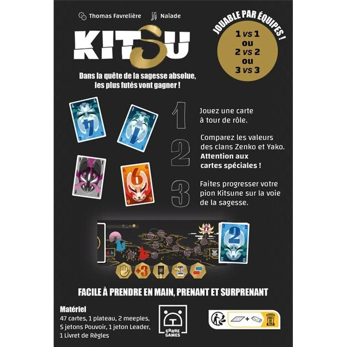 Dans ce jeu de pli : Seul ou en équipe, associez vos cartes pour faire progresser votre Kitsune sur la piste de la Sagesse.