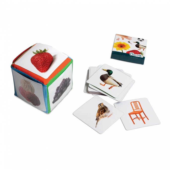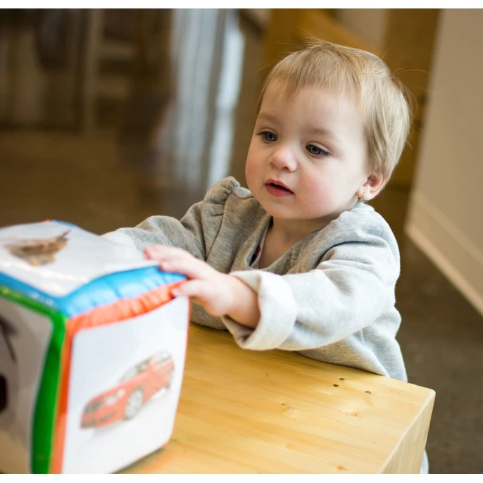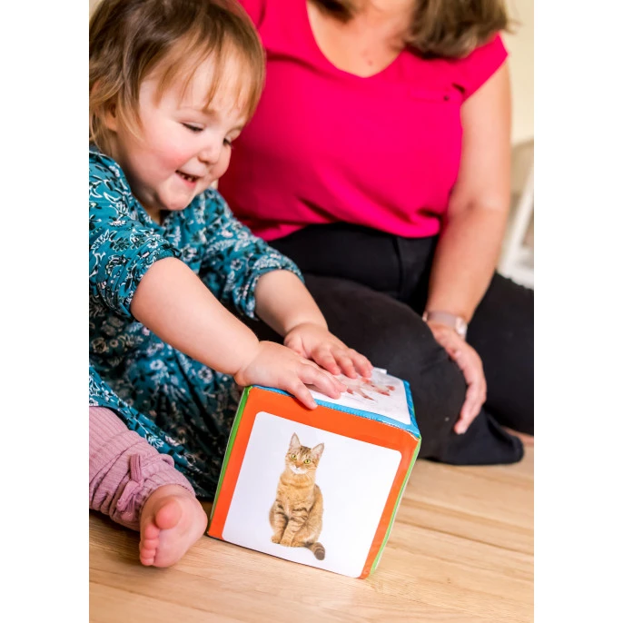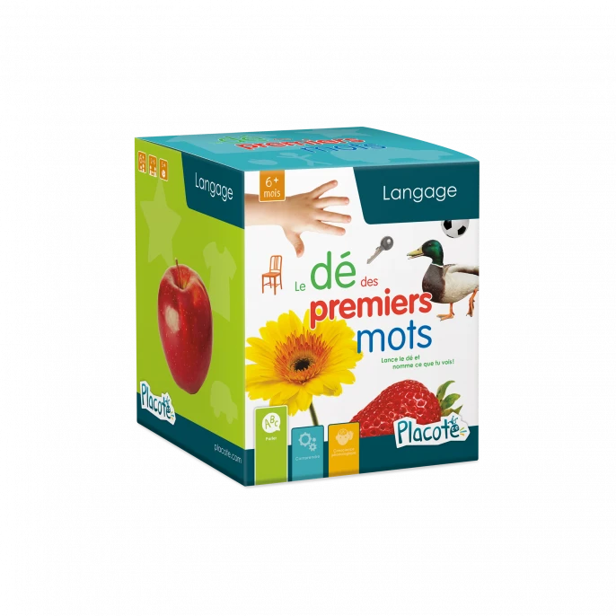 Le dé des premiers mots est conçu pour aider les enfants de 6 mois et plus à produire des sons, puis à dire des mots, vers 1 an. Les 60 photographies qui peuvent être insérées dans les pochettes du dé correspondent aux premiers noms appris par les tout-petits en général.