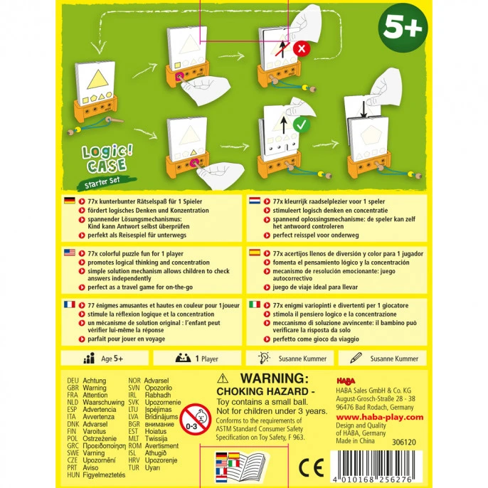 Les jeux d’énigmes Logic! CASE sont colorés, stimulants et variés ! Le but du jeu est de déchiffrer et résoudre diverses énigmes. À l’aide du stylet en bois, l’enfant peut vérifier lui-même s’il a trouvé la bonne solution : est-il possible de retirer la carte ou pas ? Cette activité renforce la motivation et la compétence dans la résolution de problèmes en toute autonomie. L’énigme est résolue ? Le prochain défi vous attend déjà !