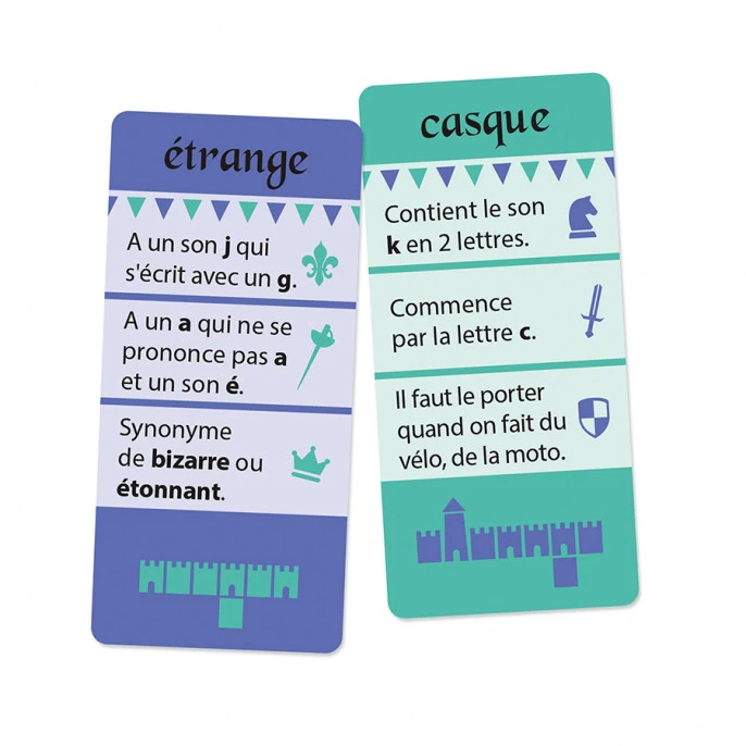 Principe des cartesLes cartes sont organisées en 6 séries qui permettent chacune de travailler une famille de difficultés orthographiques différente. Le jeu contient 100 cartes et 200 mots. Chaque face de carte représente un mot incluant une difficulté orthographique. Les indicesPour chaque mot, il y a 4 indices :