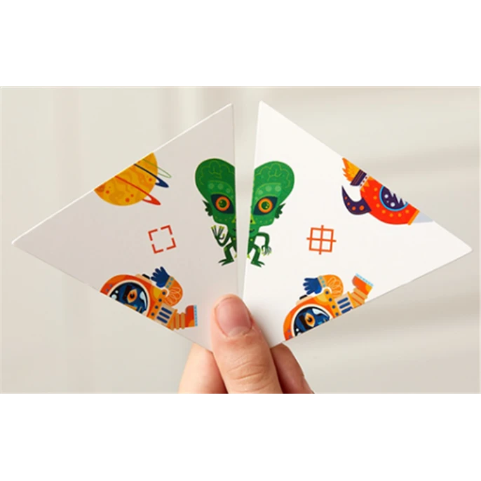 Prendre 2 cartes triangulaires et les manipuler dans ses mains jusqu’à reconstituer une image en les assemblant.