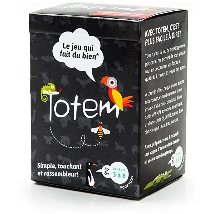 Le premier joueur à recevoir son Totem = prochaine date de fête. Ce joueur est le receveur. Portion ANIMAL du totem. Le receveur distribue 7 cartes à tous les joueurs, sauf à lui-même. Chaque joueur choisit parmi les 7 cartes la force qu’il désire souligner chez le receveur. Chacun place sa carte face cachée au centre de la table. Le receveur regrade les cartes. Il place ensuite les cartes en ordre de préférence faces cachées sur la table, de la force qu’il se reconnaît le plus à celle qu’il se reconnaît le moins. Le receveur retourne une à une ses cartes ANIMAL, en commençant par la force qui lui ressemble le moins. Le joueur qui a donné cette carte ANIMAL s’identifie et doit décrire pourquoi il a choisi cette force. Le receveur continue ensuite à retourner ses cartes une à une.Tous les joueurs expliquent leur choix au receveur. Les joueurs choisissent maintenant parmi les cartes « LA » force dominante du receveur. Cette carte constitue la portion ANIMAL du Totem du receveur. Répétez ces même étapes avec les cartes QUALITÉ. Ainsi de suite pour chacun des participants.